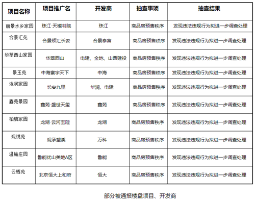 其中有11個(gè)項(xiàng)目發(fā)現(xiàn)違法違規(guī)行為,擬進(jìn)一步調(diào)查處理。違規(guī)項(xiàng)目包括鑫苑景園、柏毓家園、觀悅苑、溫榆莊園、云棲苑、合景匯苑、華萃西山家園、景玉苑、瀧潤(rùn)家園、麗景水鄉(xiāng)家園、譽(yù)悅嘉園。中海、華潤(rùn)等多家知名房企在京項(xiàng)目被通報(bào)發(fā)現(xiàn)違法違規(guī)行為,擬進(jìn)一步調(diào)查處理。