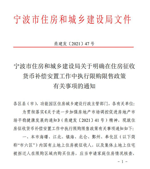 房訊網訊 5月21日,寧波市住建局發布關于明確在住房征收貨幣補償安置工作中執行限購限售政策有關事項的通知,通知提到,市六區內國有土地上住房被征收人,以及集體土地上住宅被拆遷人以無房家庭名義優先認購新建商品住房的,所購住房自取得不動產權證書之日起限售5年。