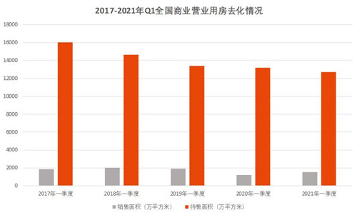 銷(xiāo)售方面,2021年一季度商業(yè)營(yíng)業(yè)用房銷(xiāo)售面積較2020年一季度增長(zhǎng)24.9%,較2019年仍有差距,并沒(méi)有完全恢復(fù)到疫情前的情況。存量上,2021年一季度商業(yè)營(yíng)業(yè)用房待售面積同比下降3.7%,庫(kù)存量相對(duì)減少。不可忽視的是,在新開(kāi)工面積增長(zhǎng)的前提下,未來(lái)市場(chǎng)仍將面臨著較大的去化壓力。
