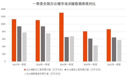 市場(chǎng)銷(xiāo)售方面,一季度全國(guó)辦公樓銷(xiāo)售面積575萬(wàn)平方米,較2020年同期增長(zhǎng)34.4%,與2019年一季度(671萬(wàn)平方米)仍有差距,但已經(jīng)顯示出疫情后良好的恢復(fù)態(tài)勢(shì)。