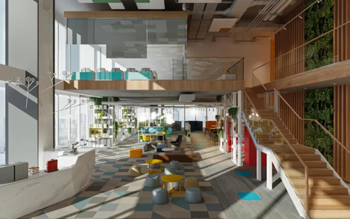 而在建筑設計上,也為打造社區環境提供新式空間組合。打破以往大平層辦公室的設計思路,加裝挑空的陽臺、挑空的室內共享空間,在打通空間、為空間帶來靈動性的同時,也可以為企業員工帶來辦公+生活的新體驗。