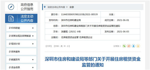 房訊網訊 6月3日,深圳市住房和建設局聯合多部門印發《關于開展住房租賃資金監管的通知》。《通知》要求,在深圳從事住房租賃經營的企業,應開立銀行專戶,用于收取承租人押金及租金;實行租賃資金監管,被監管資金不得隨意使用;規范住房租金貸款;加強監督管理。新規將于6月11日起施行,有效期2年。