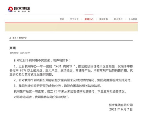 6月7日,恒大集團(tuán)針對(duì)近日傳言發(fā)表聲明稱,公司生產(chǎn)經(jīng)營(yíng)一切正常,成立25年來(lái)從未出現(xiàn)借款利息晚付、本金逾期歸還的情況。對(duì)惡意造謠者,恒大將依法追究法律責(zé)任。