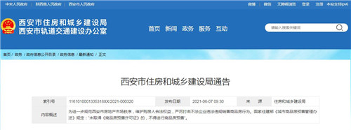 房訊網訊 6月7日,西安市住建局發布通告稱,開發企業在取得商品房預售許可前,向購房人收取或變相收取定金、預訂款、誠意金等費用屬違法違規行為。通告明確,各區(縣)、開發區住建管理部門一經發現開發企業存在違法違規銷售行為的,應依法予以查處。