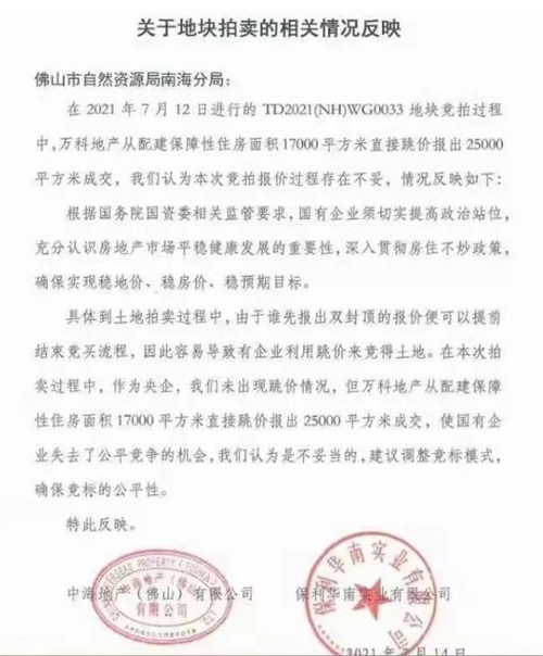 7月14日,落款為中海地產(佛山)有限公司、保利華南實業有限公司的《關于地塊拍賣的相關情況反映》被送至佛山市自然資源局南海分局!肚闆r反映》稱,土地拍賣過程中,由于誰先報出雙封頂的報價便可以提前結束競買流程,因此容易導致有企業利用跳價來競得土地。