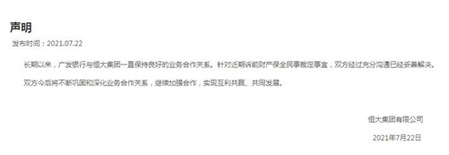 房訊網訊 7月22日,恒大集團發布聲明,稱針對近期訴前財產保全民事裁定事宜,恒大集團與廣發銀行雙方經過充分溝通已經妥善解決。雙方今后將不斷鞏固和深化業務合作關系,繼續加強合作,實現互利共贏、共同發展。