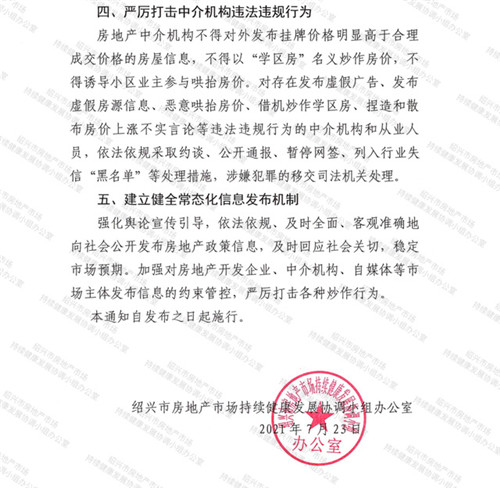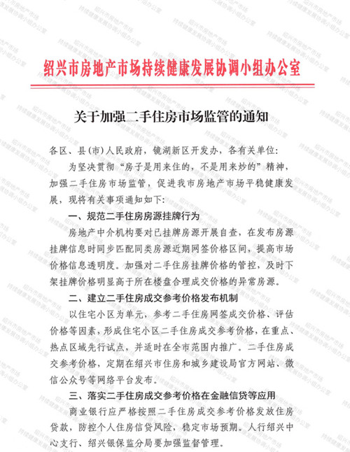 房訊網訊 近日,浙江紹興市出臺加強二手住房市場監管的通知,將加強對二手住房掛牌價格的管控,及時下架掛牌價格明顯高于所在樓盤合理成交價格的異常房源。