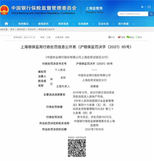 因部分流動(dòng)資金貸款違規(guī)流入房地產(chǎn)市場(chǎng),中國農(nóng)業(yè)銀行股份有限公司上海自貿(mào)試驗(yàn)區(qū)分行、中國工商銀行股份有限公司上海自貿(mào)試驗(yàn)區(qū)分行均被罰責(zé)令改正,并且罰款150萬元。中國建設(shè)銀行股份有限公司上海浦東分行則因以流動(dòng)資金貸款形式違規(guī)發(fā)放土地儲(chǔ)備貸款、個(gè)人消費(fèi)貸款違規(guī)用于購房、個(gè)人消費(fèi)貸款違規(guī)流入股市三大違規(guī)行為被罰款110萬元。