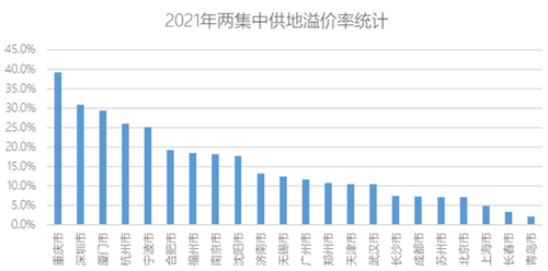 整體來看,南方城市整體熱度較高,重慶、深圳、廈門、杭州熱度領先。其中綜合溢價率最高的是未設置最高限價的重慶,達39.2%,相比于2020年提升了31.2個百分點;深圳緊隨其后,綜合溢價率達30.9%。