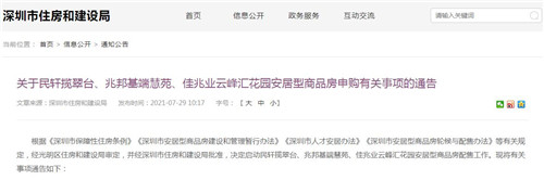 房訊網訊 7月29日,深圳市住房和建設局發布通告,經光明區住房和建設局審定,并經深圳市住房和建設局批準,決定啟動民軒攬翠臺、兆邦基端慧苑、佳兆業云峰匯花園安居型商品房配售工作。本次安居型商品房的配售對象包括深圳市安居型商品房在冊輪候人以及符合條件的領軍人才。