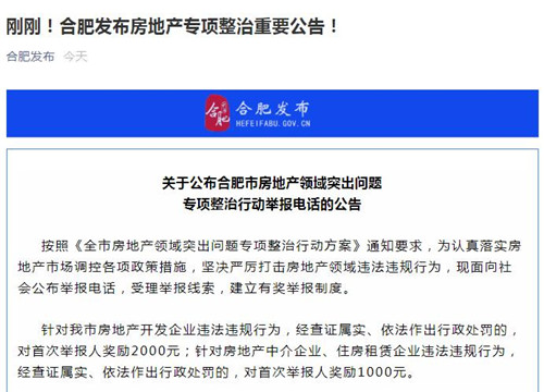 關于公布合肥市房地產領域突出問題專項整治行動舉報電話的公告