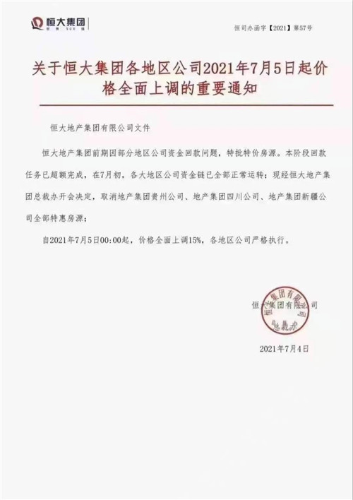 恒大回應7月5日起全面上調樓盤價格:假消息