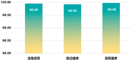 法定資質指標主要由登記信息和資質信息2個三級指標構成,據調查分析,十大商圈內企業絕大多數依法取得了提供服務的執照和經營許可等資質、證照齊全,無證經營、超范圍經營等現象極少。
