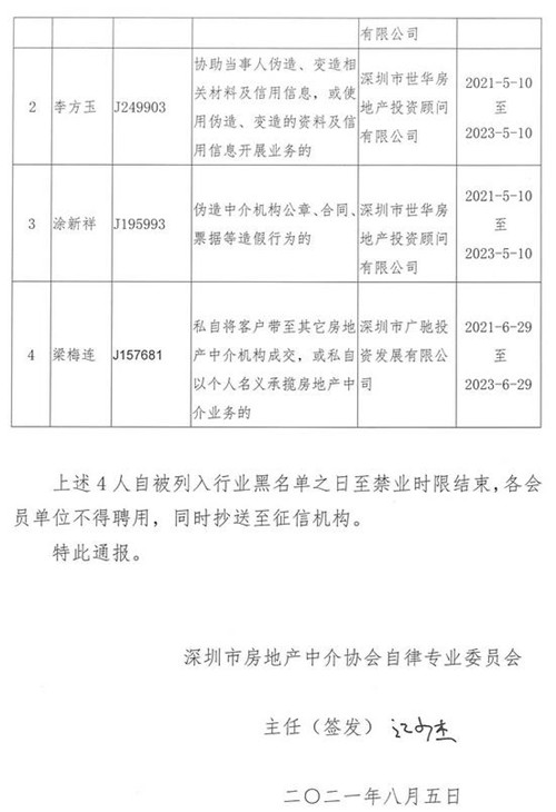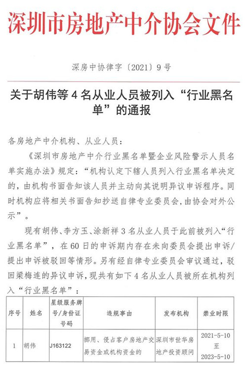 房訊網訊 8月11日,深圳市房地產中介協會發布關于胡偉等4名從業人員被列入“行業黑名單”的通報。