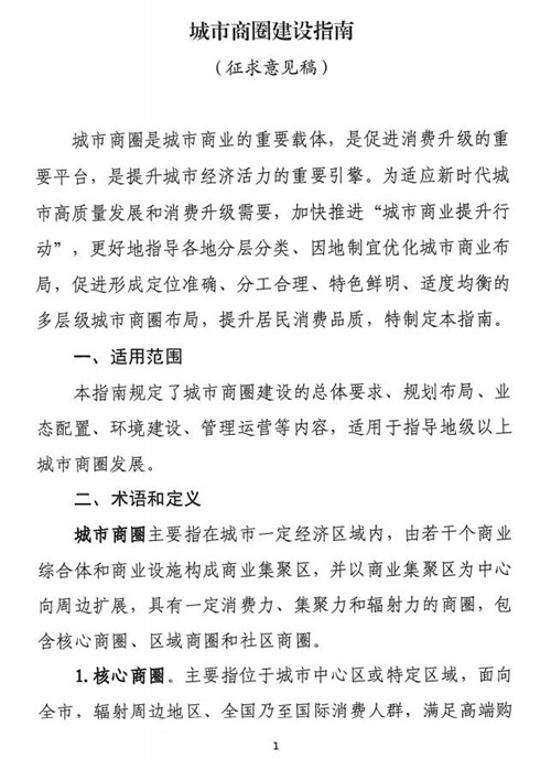 房訊網訊 8月11日,商務部發布《城市商圈建設指南(征求意見稿)》,適應城市高質量發展和消費升級需要,更好指導城市商圈建設,構建多層級城市商業體系,提升居民消費品質。