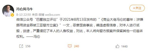 當日晚間,馮侖通過其微博回應稱,相關報道惡意歪曲事實,編造虛假信息,對他進行詆毀、誹謗,嚴重侵犯了本人的人身權(quán)益。對此,他將向警方報案并保留其他一切追訴權(quán)利。