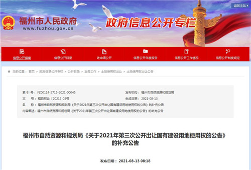 房訊網訊 8月13日,福州市自然資源和規劃局發布《關于2021年第三次公開出讓國有建設用地使用權的公告》的補充公告,稱福州土拍時間推遲至9月7日-9月8日。其中,長樂區地塊拍賣活動于2021年9月7日下午3點舉行,馬尾區地塊拍賣活動定于9月7日上午10點舉行,城四區地塊拍賣活動于9月8日上午9:30舉行。