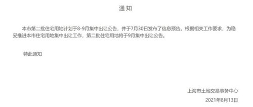 房訊網(wǎng)訊 8月13日晚,上海市土地交易事務(wù)中心發(fā)布公告稱,上海市第二批住宅用地計劃于8-9月集中出讓公告,并于7月30日發(fā)布了信息預(yù)告。根據(jù)相關(guān)工作要求,為穩(wěn)妥推進(jìn)本市住宅用地集中出讓工作,第二批住宅用地將于9月集中出讓公告。