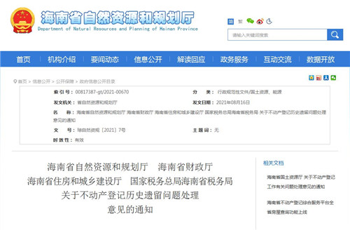 房訊網訊 近日,海南省自然資源和規劃廳、海南省財政廳、海南省住房和城鄉建設廳、國家稅務總局海南省稅務局聯合下發《關于不動產登記歷史遺留問題處理意見的通知》,對不動產登記基本原則、適用范圍、解決政策和方法等作出明確要求。本通知自發布之日起實施,有效期3年。