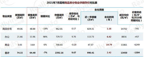 昆明銳理數據也顯示,7月昆明商品住宅成交均價環14702元/平方米,創過去一年來新低。其中呈貢、官南、滇池跌幅最大,其他片區降幅不明顯。庫存量持續走高,商品房住宅庫存從2017年的約476.22萬平方米,增加至約962.01萬平方米,庫存翻倍,去化周期也由6.87個月增至13.92個月。