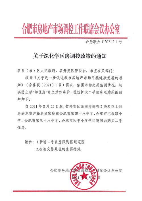房訊網訊 8月24日,合肥市住房保障和房產管理局發(fā)布《關于深化學區(qū)房調控政策的通知》,依據市場交易情況,防止以“學區(qū)房”名義炒作房價,擴大二手住房限購范圍。