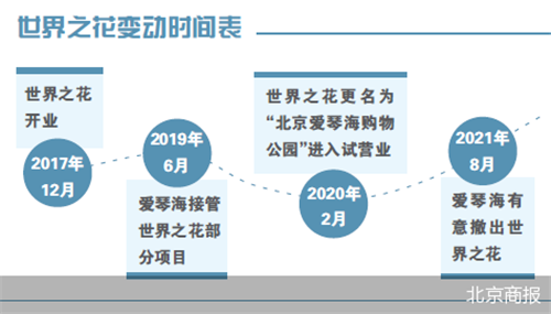 世界之花于2017年底正式開業(yè),但由于運營不當,商戶大面積撤出,導(dǎo)致世界之花項目停擺。2019年6月,愛琴海購物公園與世界之花完成簽約,從此正式接管運營世界之花部分項目,租約為20年。
