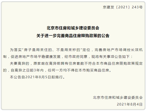 房訊網訊 8月5日,北京市住建委發布《關于進一步完善商品住房限購政策的公告》,明確夫妻離異的,若原家庭在離異前已擁有2套及以上住房,自離異之日起3年內,任何一方均不得在本市購房。