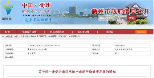房訊網訊 8月7日,浙江衢州發布《關于進一步促進市區房地產市場平穩健康發展的通知》,從實行限購管理、擴大限售范圍、加強稅收調節、建立二手住房成交參考價格發布機制、規范二手住房房源信息發布等五個方面入手,促進市區房地產市場平穩健康發展。