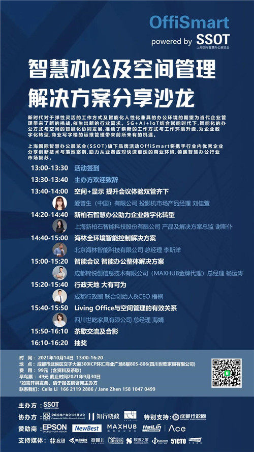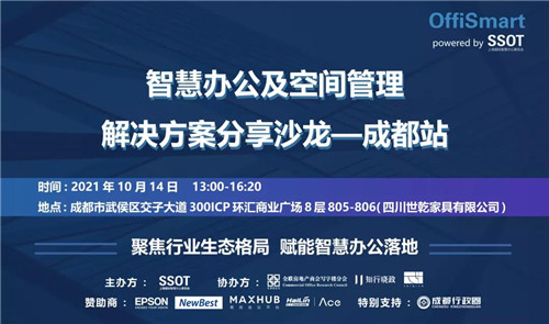 本次OffiSmart智慧辦公及空間管理解決方案分享沙龍—10.14成都站特邀愛普生、新柏石、海林、成都錦悅創(chuàng)、成都行政圈及世乾家具等企業(yè)探討智慧辦公及商業(yè)空間管理的未來趨勢,分享創(chuàng)新技術(shù)與落地案例,呈現(xiàn)解決用戶實(shí)際需求的智慧辦公整體解決方案,助力業(yè)者應(yīng)對(duì)快速更迭的商業(yè)環(huán)境,領(lǐng)跑智慧辦公行業(yè)市場復(fù)蘇。