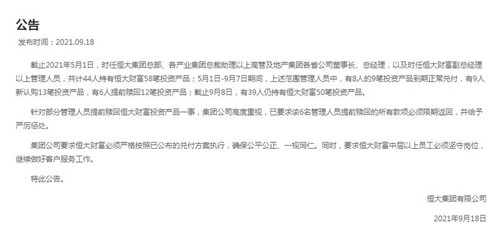 房訊網訊 9月18日凌晨,恒大集團官方網站發布公告稱,針對部分管理人員提前贖回恒大財富投資產品一事,集團公司高度重視,已要求該6名管理人員提前贖回的所有款項必須限期返回,并給予嚴厲懲處。