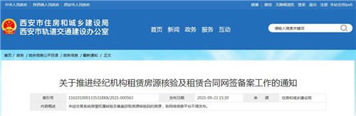 房訊網訊 9月23日,西安市住建局發布《關于推進經紀機構租賃房源核驗及租賃合同網簽備案工作的通知》,明確9月房地產經紀機構受托發布住房租賃房源信息的,須通過“西安市房地產經紀機構開戶和二手房交易管理系統”進行房屋權屬核驗及備案獲取房源核驗碼。未經交易系統房屋權屬核驗及備案獲取房源核驗碼的房源,各網絡信息平臺不得發布。