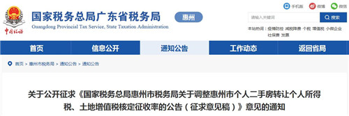 房訊網訊 9月22日,國家稅務總局惠州市稅務局發布通知,就《關于調整惠州市個人二手房轉讓個人所得稅、土地增值稅核定征收率的公告(征求意見稿)》公開征求意見,意見反饋截至日期為2021年10月21日。
