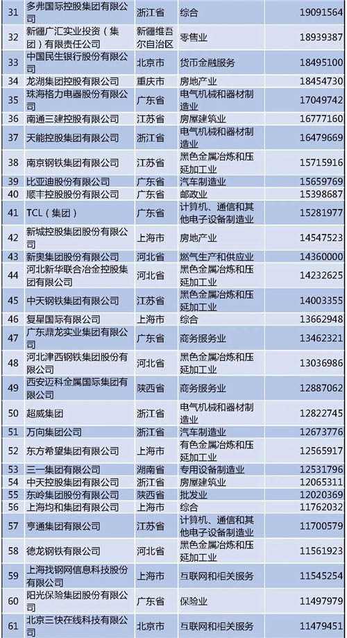 民營企業500強入圍門檻達235.01億元,比上年增加32.97億元;制造業民營企業500強入圍門檻達100.51億元,比上年增加11.33億元;服務業民營企業100強入圍門檻達322.76億元,比上年增加33.25億元。13家企業營業收入超3000億元,其中,華為投資控股有限公司(8913.68億元)、京東集團(7686.24億元)、恒力集團有限公司(6953.36億元)、正威國際集團有限公司(6919.37億元)、阿里巴巴(中國)有限公司(6442.08億元)等5家企業營業收入超過6000億元。華為投資控股有限公司以8913.68億元的營業收入規模,連續六年位居民營企業500強榜首、制造業民營企業500強榜首。京東集團位居服務業民營企業100強首位。資產總額超過千億規模的企業有98家,比上年增加18家。中國民生銀行股份有限公司以6.95萬億元的規模位居民營企業500強資產總額榜首。共有31家內地民營企業500強入圍世界500強。