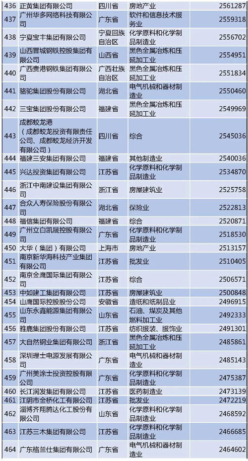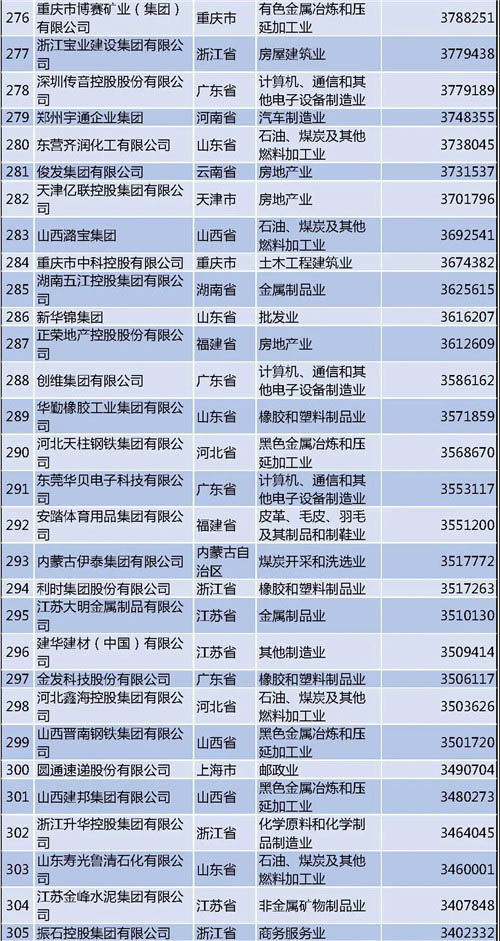 三、產業分布情況。第二產業入圍企業319家,其中,制造業企業277家,繼續保持主導地位。第三產業入圍企業177家,比上年增加13家,資產總額和營業收入總額分別占500強的66.35%和38.89%。民營企業500強前十大行業共包含315家企業,比上年減少5家,黑色金屬冶煉和壓延加工業、房地產業、綜合、建筑業繼續位居前四位。