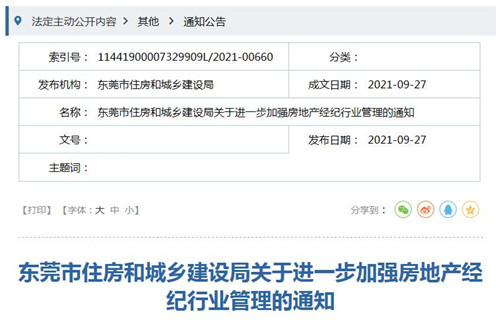 東莞市住房和城鄉建設局關于進一步加強房地產經紀行業管理的通知