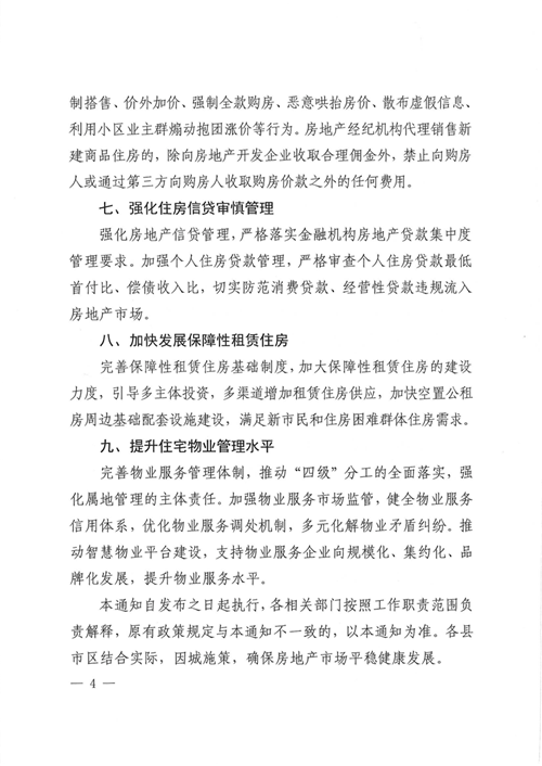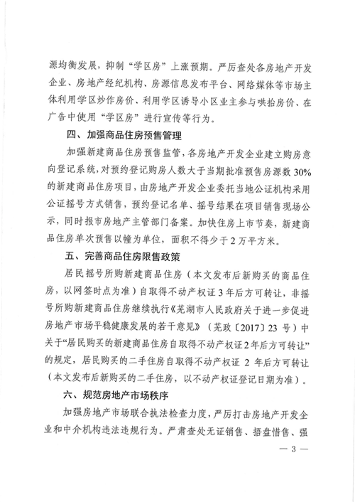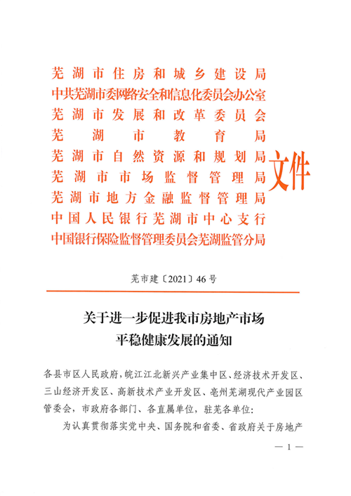 房訊網(wǎng)訊 9月3日,蕪湖市住建局等9部門聯(lián)合發(fā)布《關(guān)于進(jìn)一步促進(jìn)房地產(chǎn)市場(chǎng)平穩(wěn)健康發(fā)展的通知》,從優(yōu)化住宅用地供應(yīng)機(jī)制、嚴(yán)格住房?jī)r(jià)格備案管理、嚴(yán)禁利用學(xué)區(qū)炒作房?jī)r(jià)、加強(qiáng)商品住房預(yù)售管理、完善商品住房限售政策、規(guī)范房地產(chǎn)市場(chǎng)秩序、強(qiáng)化住房信貸審慎管理、加快發(fā)展保障性租賃住房、提升住宅物業(yè)管理水平等九方面入手,確保房地產(chǎn)市場(chǎng)平穩(wěn)健康發(fā)展。