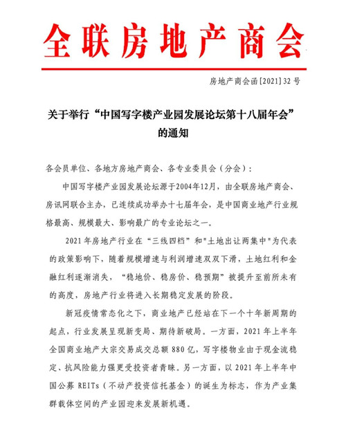 房訊網訊 中國寫字樓產業園發展論壇第十八屆年會定于2021年12月8-9日在北京富力萬麗酒店舉行,論壇主題為“變局與破局:商業地產的下一個十年”。