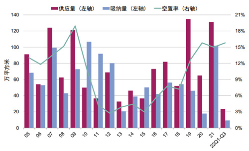 2022年第三季度,北京寫字樓市場又一次進入復蘇周期。三季度市場租賃活動均已回歸常態,且有部分因疫情而延誤的租賃成交在本季度完成簽約,但受經濟下行、租賃需求調整等多重因素影響,這一輪復蘇過程中的市場活躍度較為有限,并未重現2021年的快速反彈。
