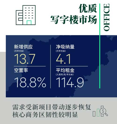 租金方面,受前期轉租公司及小業主較激進的調價策略影響市場競爭持續,從核心及非核心區租金趨勢基本皆呈現更明顯的下調幅度以期激活市場加速回暖,至此,全市租金環比明顯下調2.0%至每月每平方米114.9元,此輪受市場波動影響較大或部分大租戶即將遷至自用樓宇的黃龍、未來科技城等子市場引領。