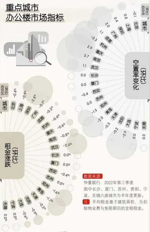 從前三季度的寫字樓市場來看,除頭部城市表現出企穩向好的態勢以外,其他重點城市受制于經濟波動和疫情影響,辦公樓租賃擴張受阻,市場承壓。