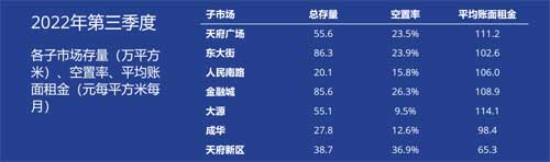 金融城與東大街子市場較為活躍,其新增租賃面積占比分別為30.3%、22.5%。第三季度,上述兩個子市場吸納了多宗2,000平方米以上的租賃交易,包含教育培訓、房地產、餐飲及醫美等行業。