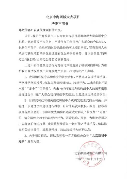 10月19日,北京中信房地產有限公司唯一官方微信公眾號“北京新城中海家”發布關于北京中海西城大吉項目的嚴正聲明,稱近日公司所開發菜市口東南側大吉項目周遭出現大量房屋中介機構,惡意散發不實信息。聲明表示,公司嚴格遵守各項法律法規,嚴格杜絕倒賣樓號、收取房票等涉嫌違法、違規行為,從未收取過“茶水費”“定金”“團購費”,也未與任何第三方機構或個人的拓客渠道進行過合作。