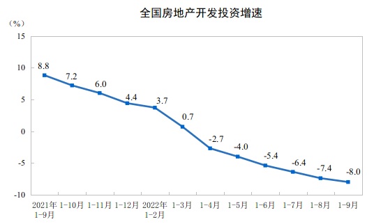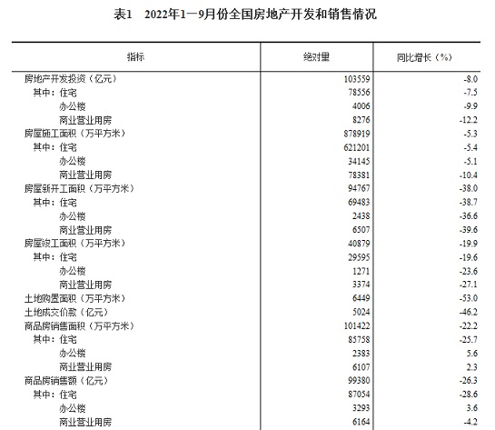 國家統(tǒng)計(jì)局近日發(fā)布全國房地產(chǎn)市場運(yùn)行情況數(shù)據(jù)顯示,1-9月份,全國房地產(chǎn)開發(fā)投資103559億元,同比下降8.0%;其中,住宅投資78556億元,下降7.5%;辦公樓投資4006億元,下降9.9%。