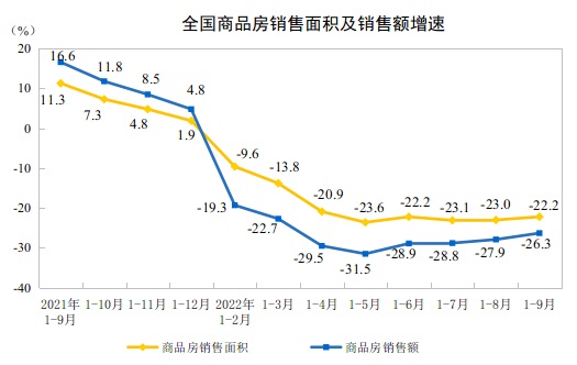 商品房銷售情況來看,1-9月份,商品房銷售面積101422萬平方米,同比下降22.2%,其中住宅銷售面積下降25.7%。商品房銷售額99380億元,下降26.3%,其中住宅銷售額下降28.6%。