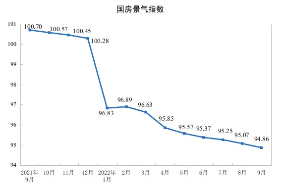9月份,房地產(chǎn)開發(fā)景氣指數(shù)(簡稱“國房景氣指數(shù)”)為94.86。