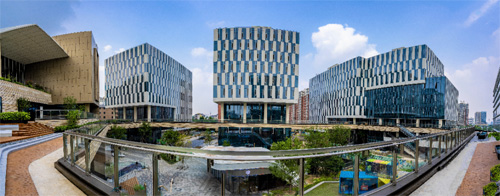 五重立體樓宇花園引入自然花、溪、風等景觀,與外部生態景觀相得益彰,形成獨具特色的生態屬性,通過構建下沉庭院、藝術中庭、連廊、露臺、屋頂花園五重植被,層次突出,成為獨具特色的“生態會客廳”,為員工休憩、商務會晤創造優質體驗場。
