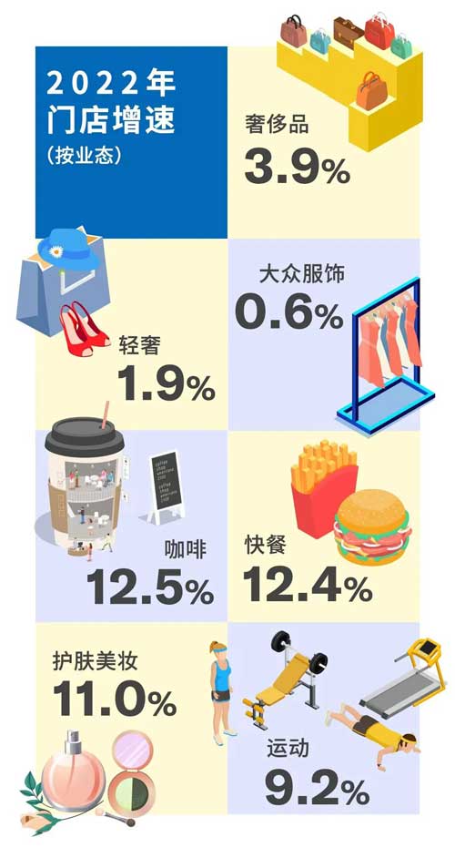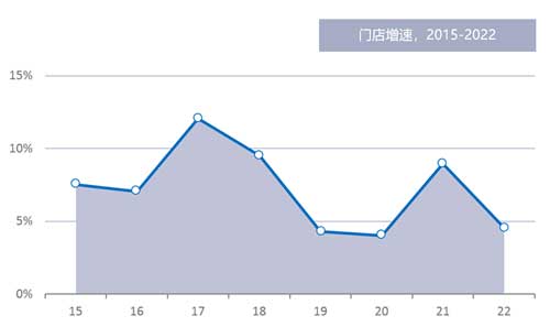 雖然國內疫情反復、全球政治經濟環境面臨嚴峻情形,國際品牌在中國內地市場整體依然保持同比擴張態勢。2022年的門店平均增速雖然較2021年明顯放緩,但較2020年依然高出2個百分點。