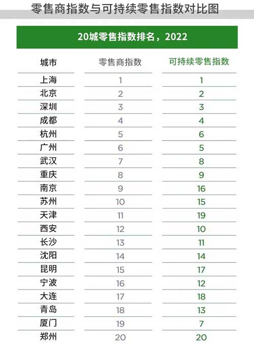 上海、北京、深圳、成都依然位列零售商指數前四位。自我們觀察指數紀錄以來,這四座城市排名從未發生變化。前十位排名中,武漢首次超越重慶位列第7位;而蘇州排名跳升兩位,取代西安首次進入前十。