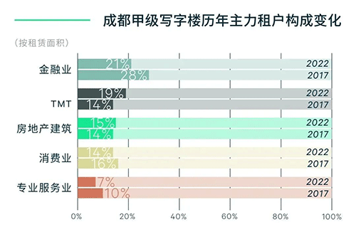 金融業的需求規模有所減少,主要是源于非傳統金融業的需求占比較2017年下降6%。房地產建筑方面,盡管近年來行業調整導致傳統房地產開發商的辦公面積出現一定收縮,但成渝雙城經濟圈和公園城市建設的雙重機遇之下,城鎮化進程積極推進,基建工程類企業擴張勢頭不減,致使房地產建筑的需求占比較2017年仍上升1個百分點至15%。