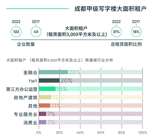 成都謀求高質量發展新支點,塑造總部經濟新格局,而不斷發展的寫字樓市場規模與質量為這一聚勢提供了土壤。一方面,更多頭部企業在蓉布局,設立區域型總部;另一方面,積極培育本土企業,逐步形成總部效應。普查數據顯示,面積需求在3,000平方米及以上的大面積租戶數量成倍增長,從2017年的45家增長至2022年的133家,其所租用的辦公面積在整體需求中的占比也相應地擴大,上升13個百分點至31%。從行業端看,金融業和TMT主導大面積段需求,分別占比28%和20%。